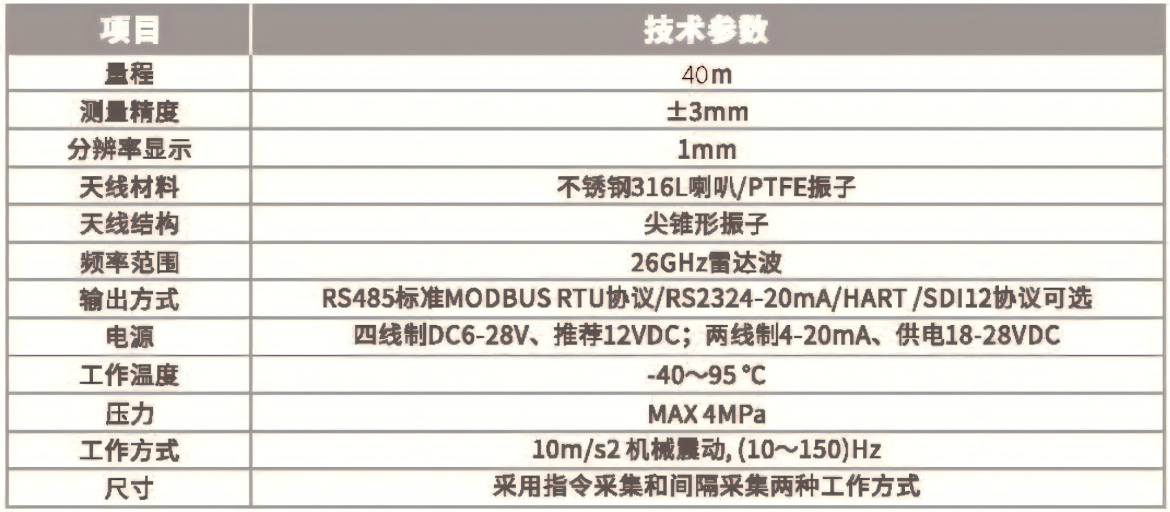 采用铝合金外壳,全天候,高频微波测距技术、抗干扰能力强